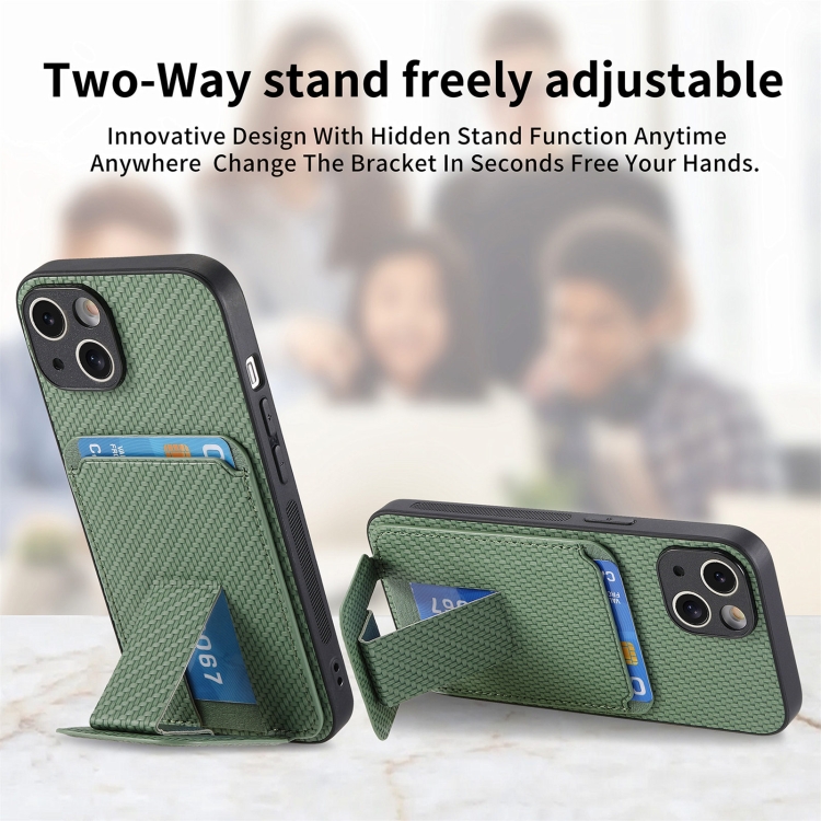 Funda para Teléfono iPhone 15 con Soporte Plegable y Bolsa para Tarjetas Fibra de Carbono (Verde)