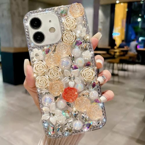 Estuche para Teléfono iPhone 15 Plus PC Pearl Diamond Rose Hecho a Mano (Albaricoque)