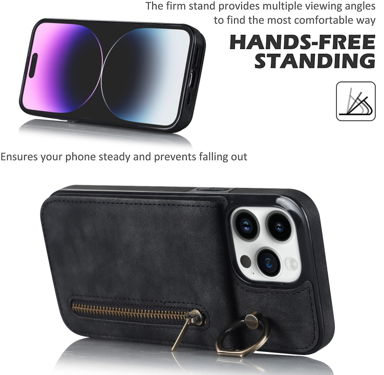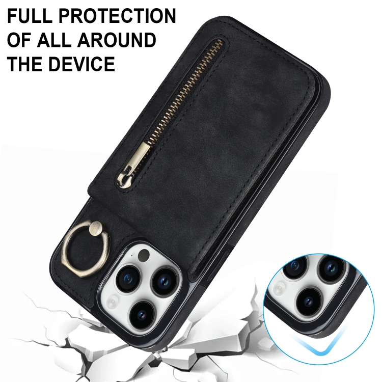 Estuche para teléfono iPhone 15 Plus con ranura para tarjeta RFID anillo retro y cremallera (Negro)