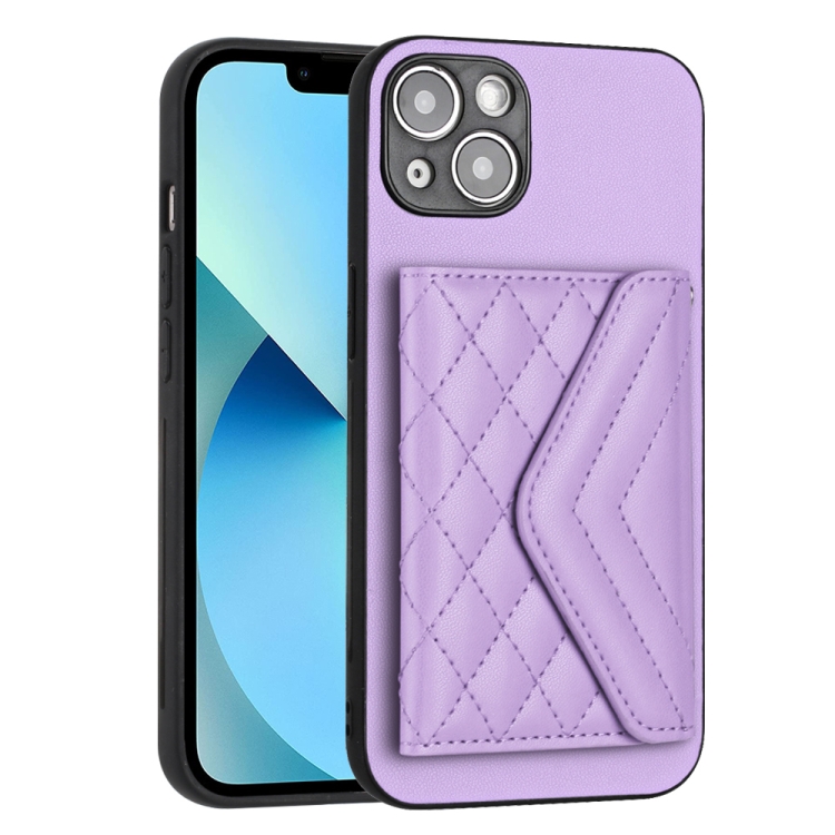 Estuche para Teléfono iPhone 15 Plus Rfid con Bolsa para Tarjetas Textura Rómbica Cordón Largo (Púrpura Claro)