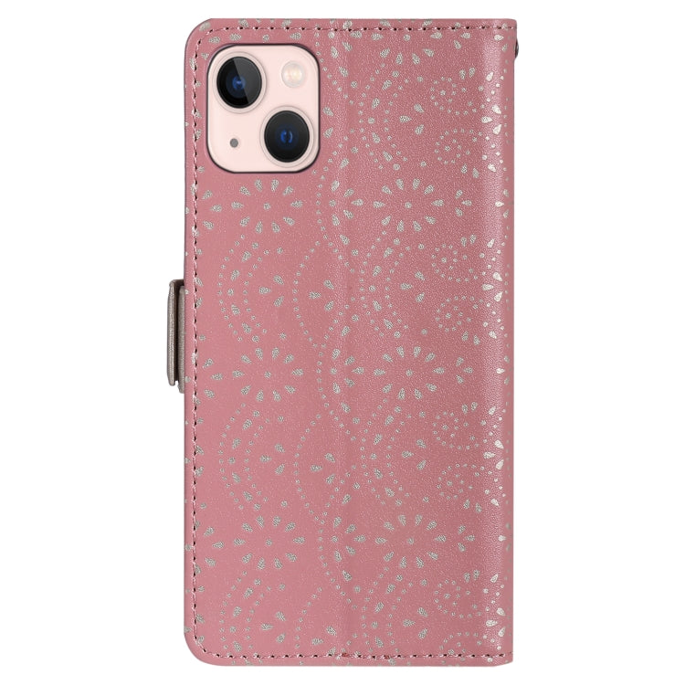 Funda de Cuero para iPhone 15 Plus con Cremallera y Doble Botón Patrón de Encaje y Cordón (Oro Rosa)