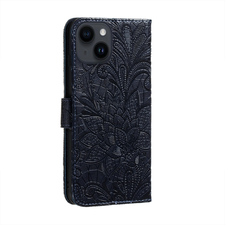 Funda para iPhone 15 Plus Cuero con Tapa Estampado Flores de Encaje (Azul Oscuro)