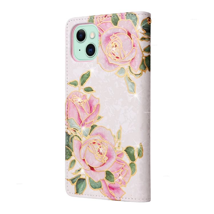 Funda de Cuero RFID para iPhone 15 Plus con Pintura Bronceadora (Flor Rosa)