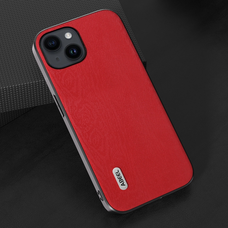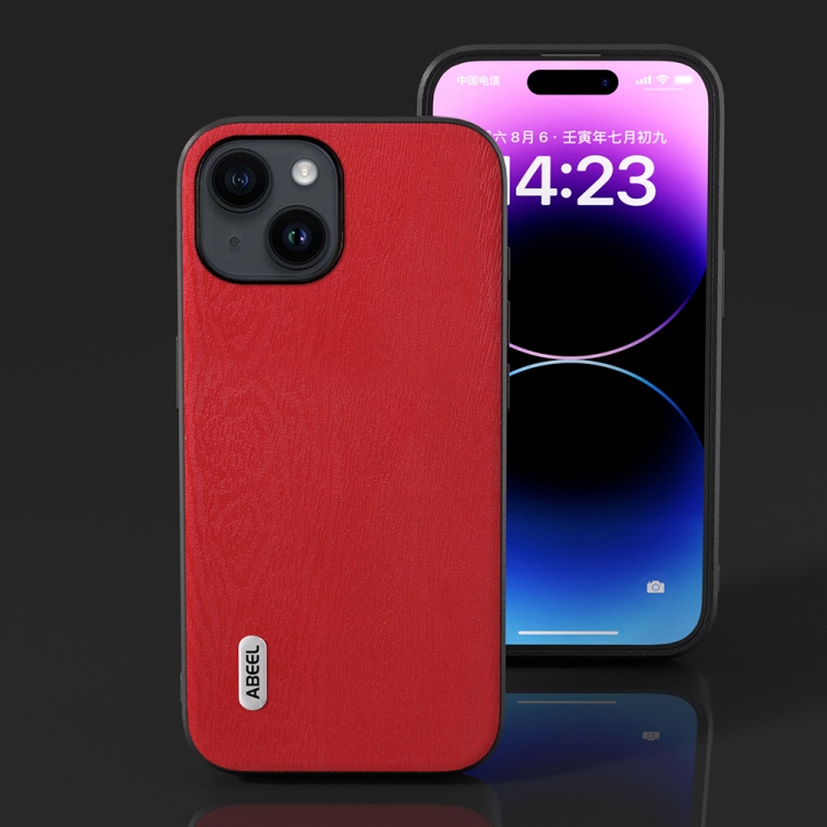 Funda de teléfono iPhone 15 Plus Abeel con textura de madera PU (Rojo)