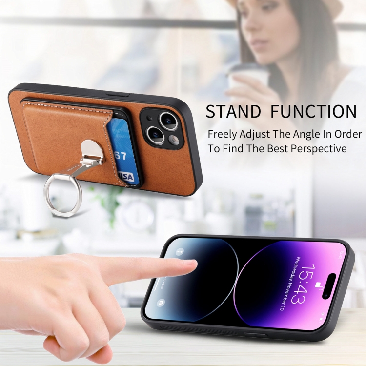 Funda para iPhone 15 Plus Skin Feel Ring Holder Wallet Magnética (Marrón)