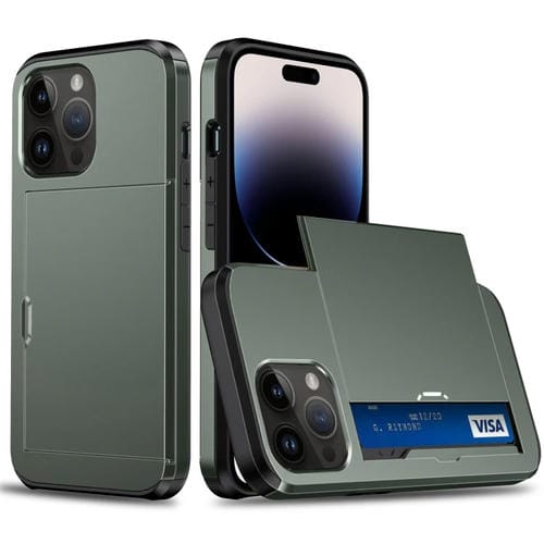 Estuche para teléfono iPhone 15 Pro con armadura a prueba de golpes y ranura para tarjeta deslizante (Verde Militar)