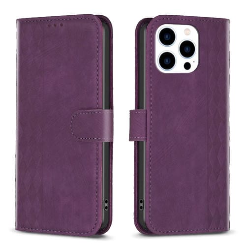Funda de Teléfono iPhone 15 Pro Cuero En Relieve a Cuadros (Púrpura)