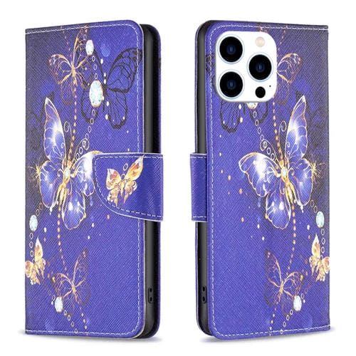 Funda para iPhone 15 Pro Flip Cuero Patrón de Dibujo Coloreado (Mariposa Púrpura)