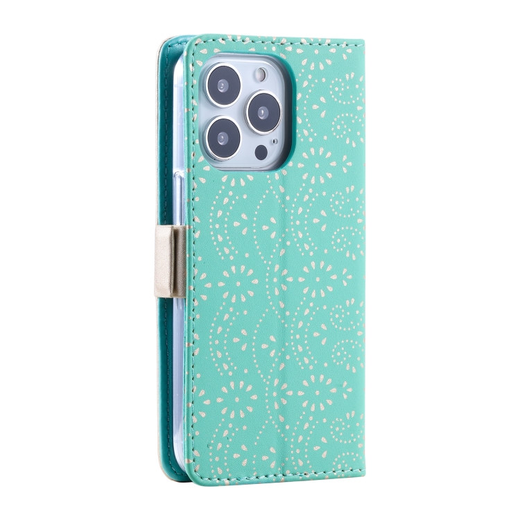 Funda para iPhone 15 Pro Patrón de Encaje Botón Doble Cremallera Cuero con Cordón (Verde)