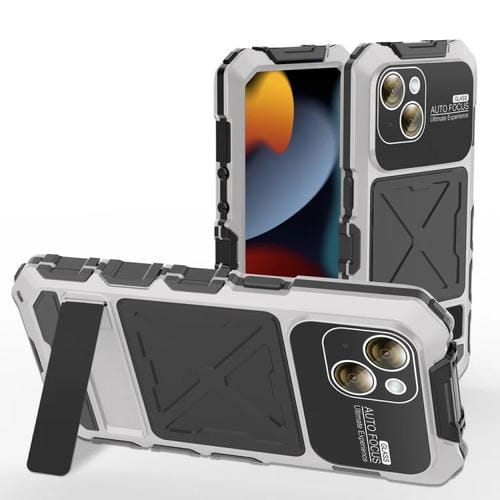 Funda para iPhone 15 R-Just Metal + Silicona + Vidrio Templado Impermeable con Soporte (Plata)