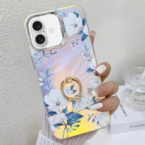 Caja de teléfono TPU para iPhone 16 con soporte de anillo y flor láser de galvanoplastia (Flor Blanca Ah10)