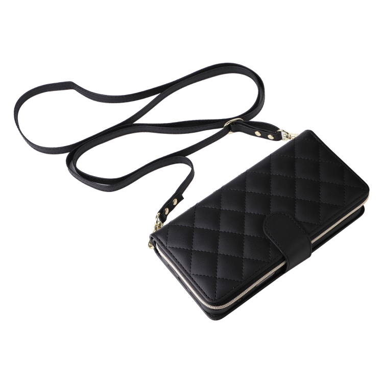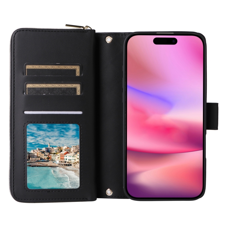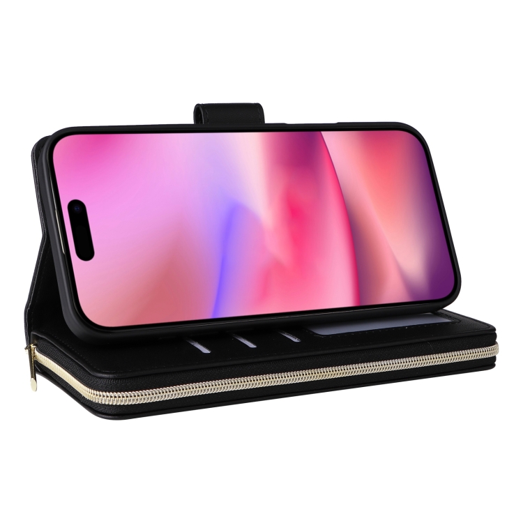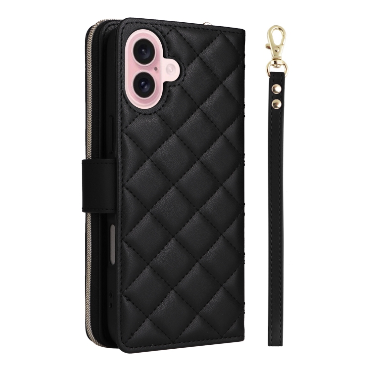 Funda para Teléfono iPhone 16 Cuero con Hebilla de Torre y Cremallera Rómbica Cruzada con Cordón (Negro)
