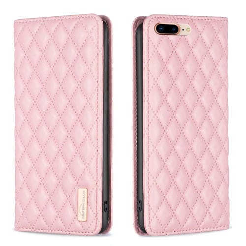 Funda de teléfono para iPhone 8 Plus y 7 Plus con tapa de cuero magnético Diamond Lattice (Rosa)