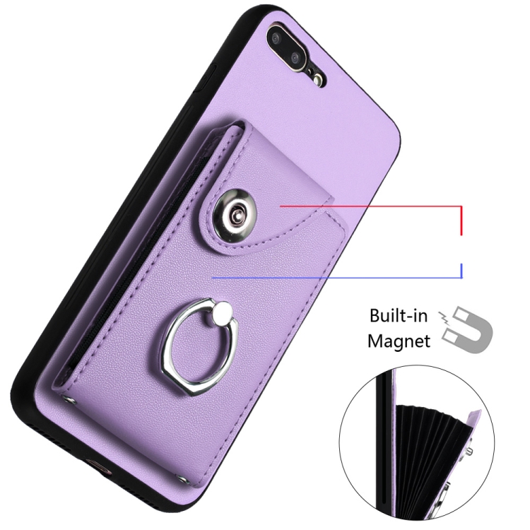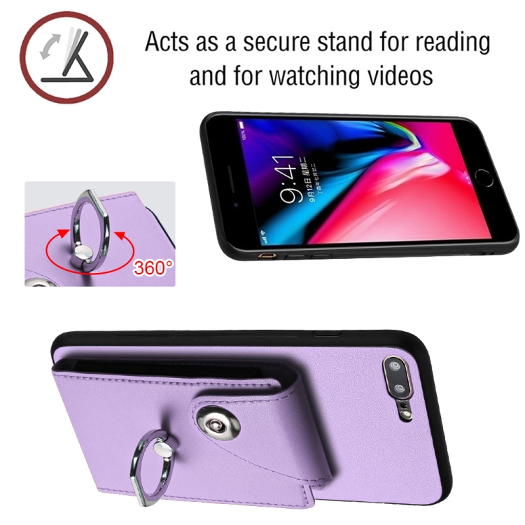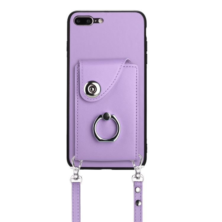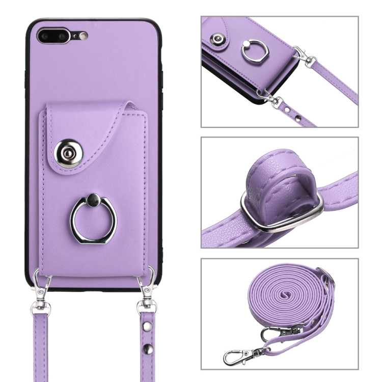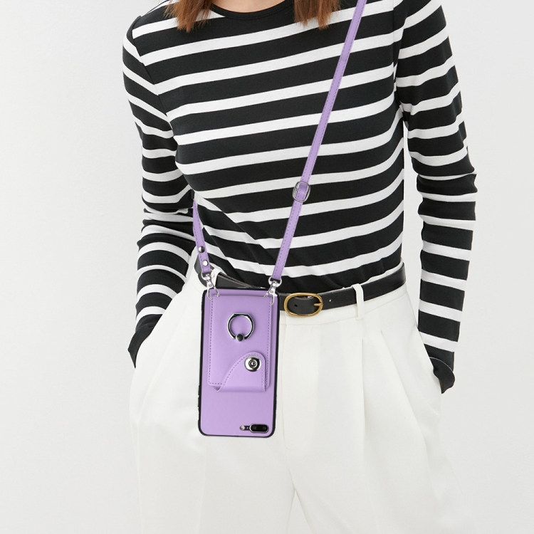 Funda para teléfono iPhone 8 Plus/7 Plus con soporte para anillo y bolsa para tarjeta con cordón largo (Púrpura)
