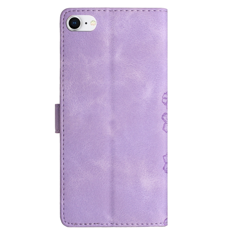 Funda para iPhone Se 2022 y Se 2020 PU con Sensación de Piel Mariposa y Flor de Cerezo En Relieve (Púrpura)