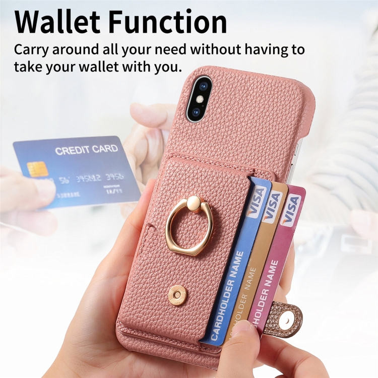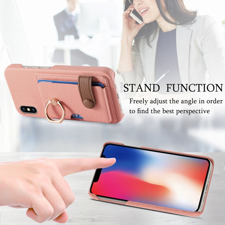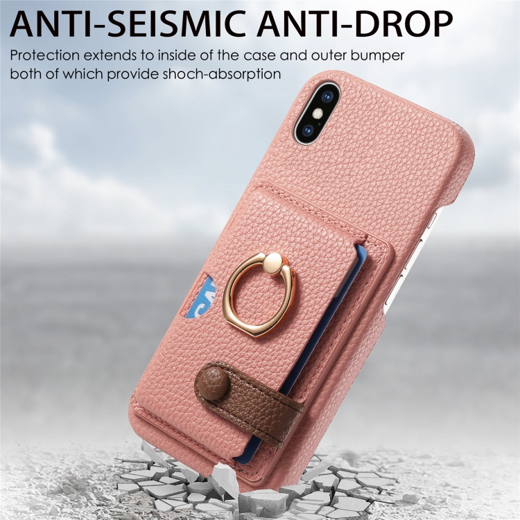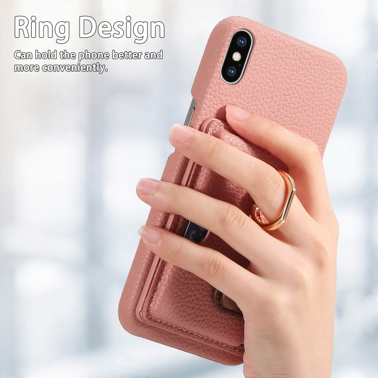 Funda para Teléfono iPhone X / Xs con Parte Posterior de Tarjeta Anillo y Borde Aceite Cuero Litchi (Rosa)