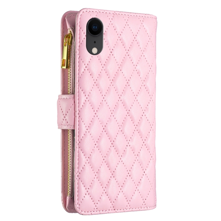 Funda para iPhone Xr Diamond Lattice Zipper Wallet de Cuero con Tapa (Rosa)