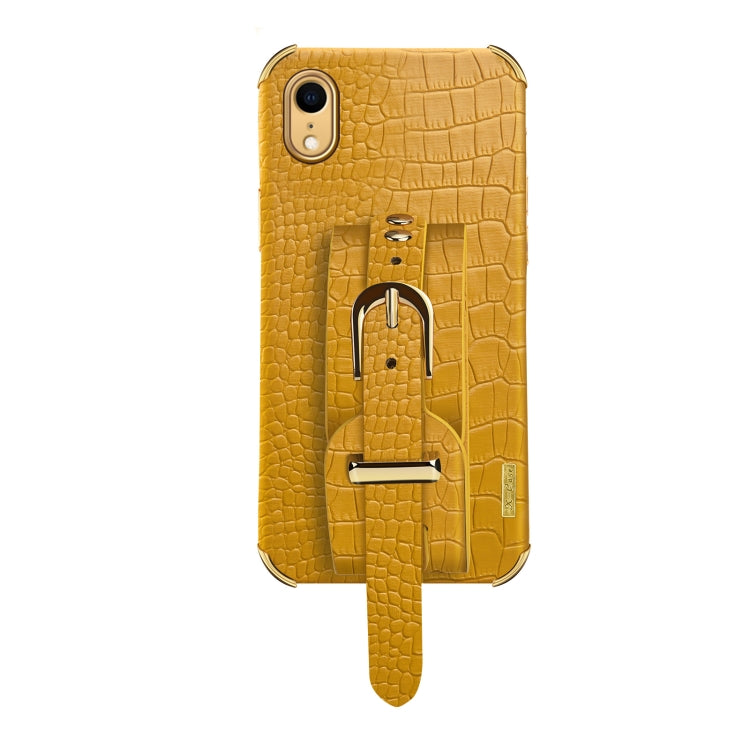 Estuche de Cuero para iPhone Xr con Patrón de Cocodrilo TPU Galvanizado y Correa para la Muñeca (Amarillo)