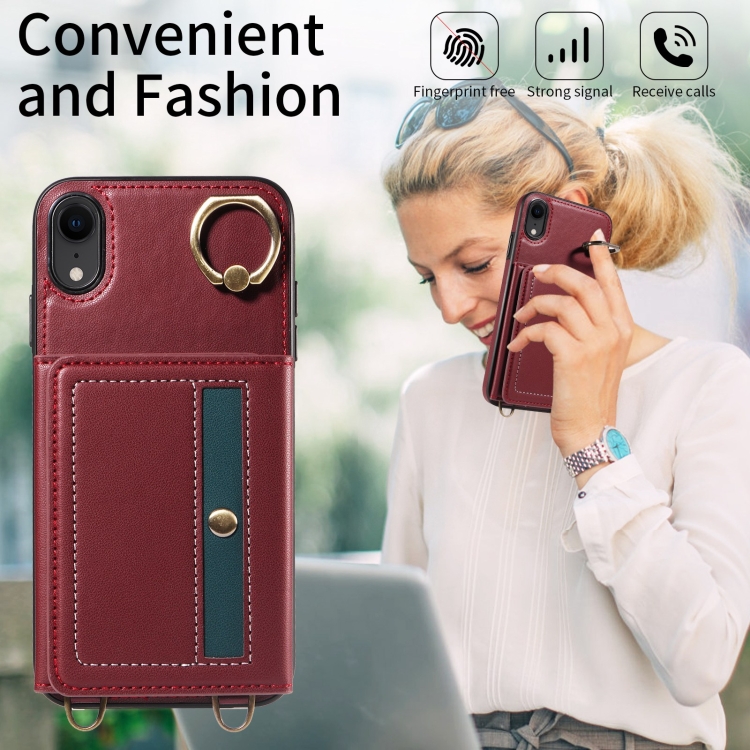Funda para Teléfono iPhone Xr Cuero con Soporte para Anillo y Bolso Cruzado para Tarjeta (Rojo)