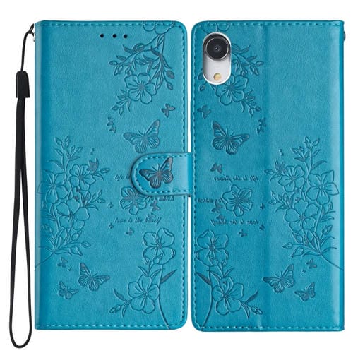 Funda para Teléfono iPhone Xr Cuero con Relieve Flor de Amor y Mariposa (Azul)