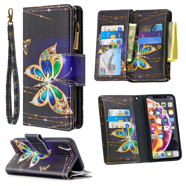Funda de Cuero para iPhone Xr con Patrón de Dibujo a Color Cremallera, Tapa Horizontal, Soporte y Ranuras para Tarjetas (Mariposa Grande)
