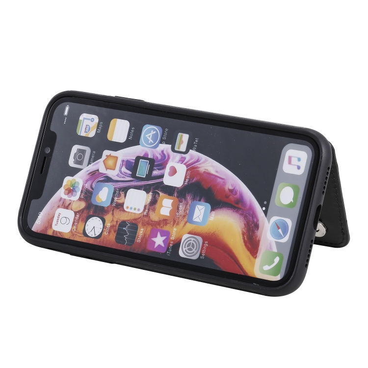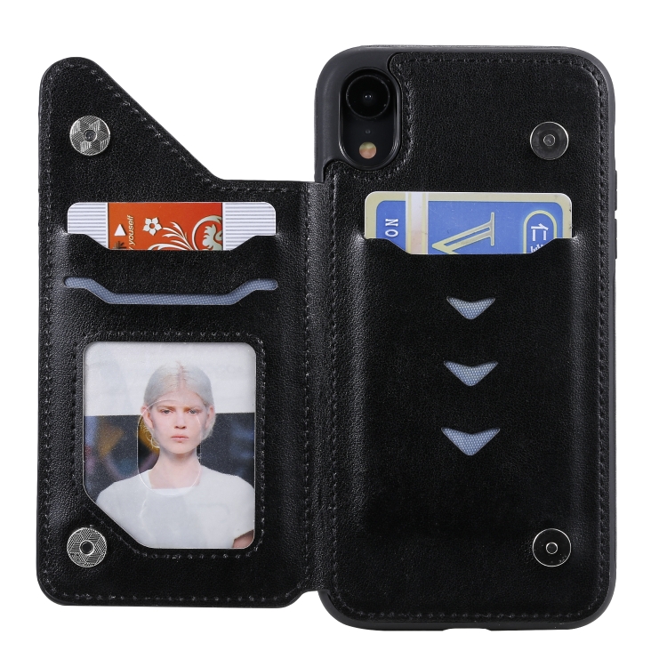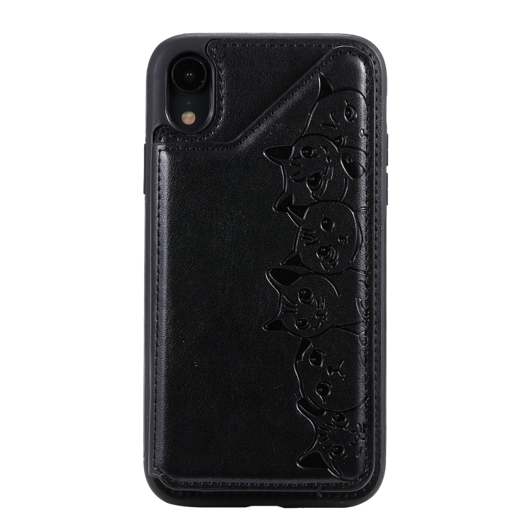 Estuche protector para iPhone Xr Six Cats con patrón de relieve, soporte, ranuras para tarjetas y marco de fotos (Negro)