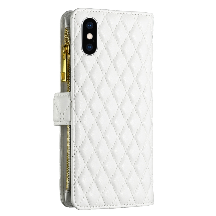 Funda para iPhone Xs Max Diamond Lattice Zipper Wallet de Cuero con Tapa (Blanco)