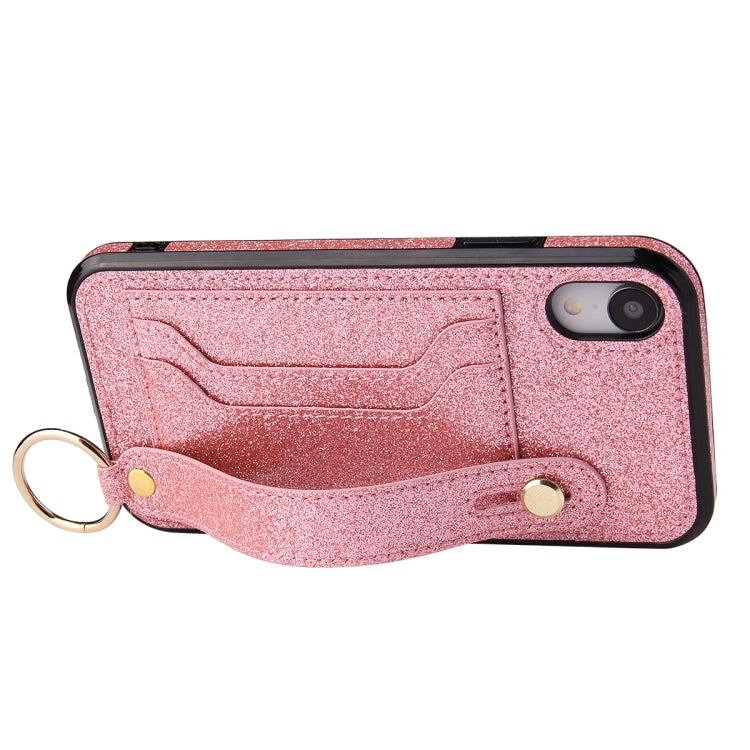 Estuche protector para iPhone Xs Max Glitter Powder PU + TPU a prueba de golpes con soporte y ranuras para tarjetas y correa para la muñeca (Rosa)