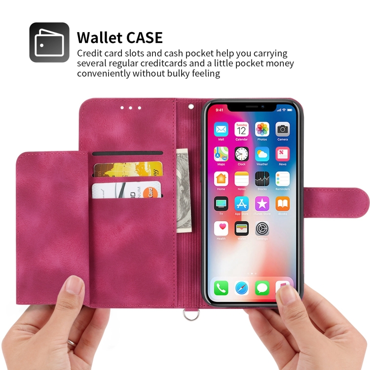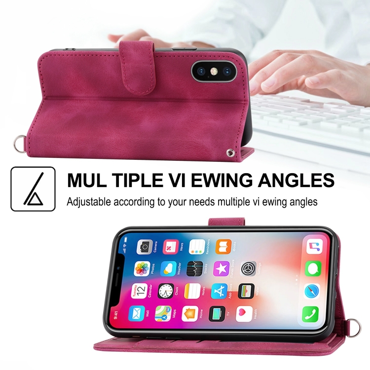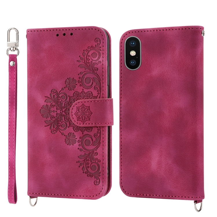 Funda de Cuero Skin-Feel Flowers para iPhone Xs Max con Billetera en Relieve (Rojo Vino)