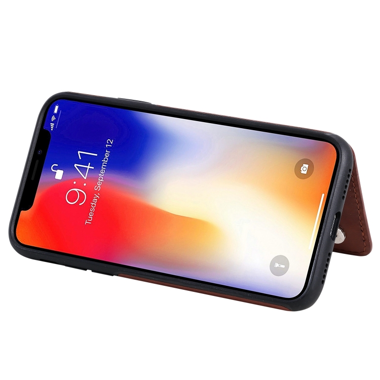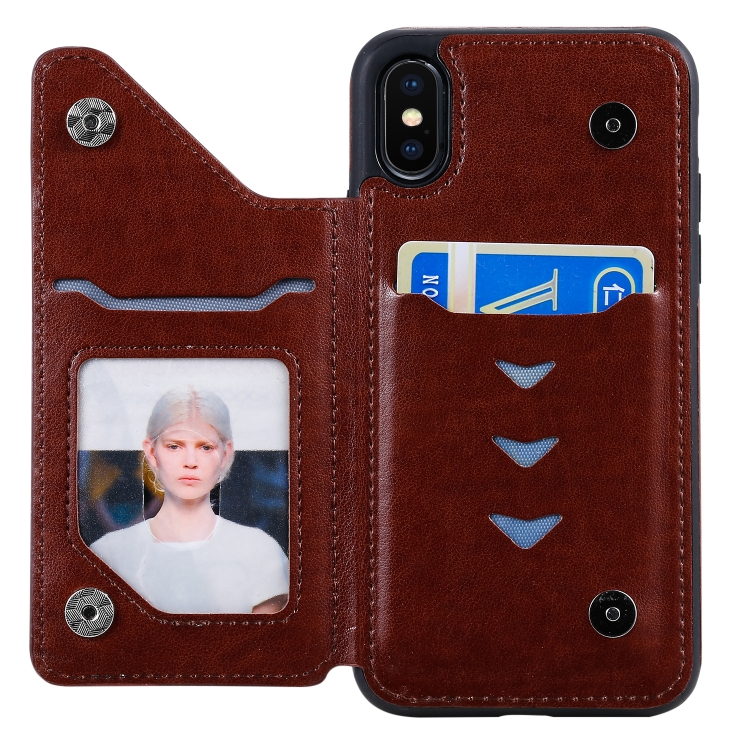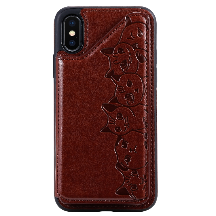 Estuche protector para iPhone Xs Six Cats con patrón en relieve, soporte, ranuras para tarjetas y marco de fotos (Marrón)
