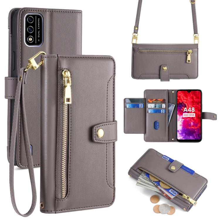 Estuche de Cuero para Itel A48 con Billetera, Cremallera y Cuerpo Cruzado (Gris)