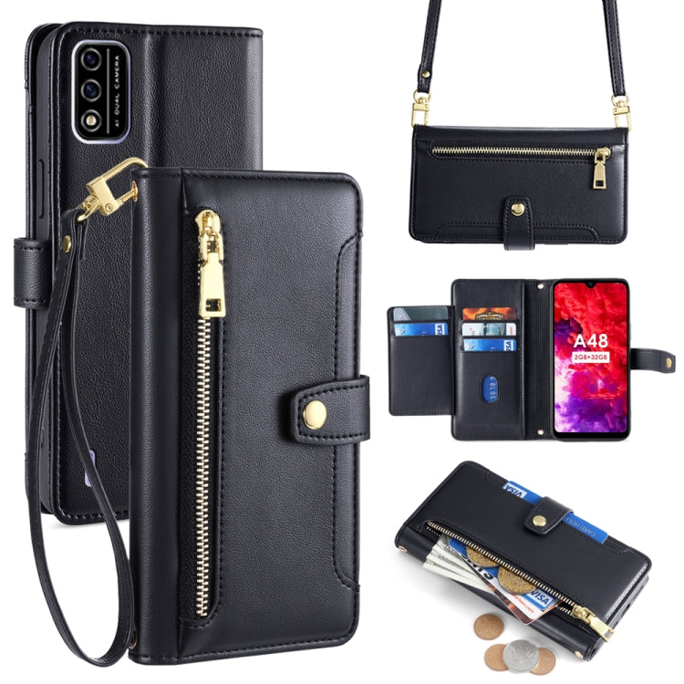 Estuche de Cuero para Itel A48 con Billetera, Cremallera y Cuerpo Cruzado (Negro)