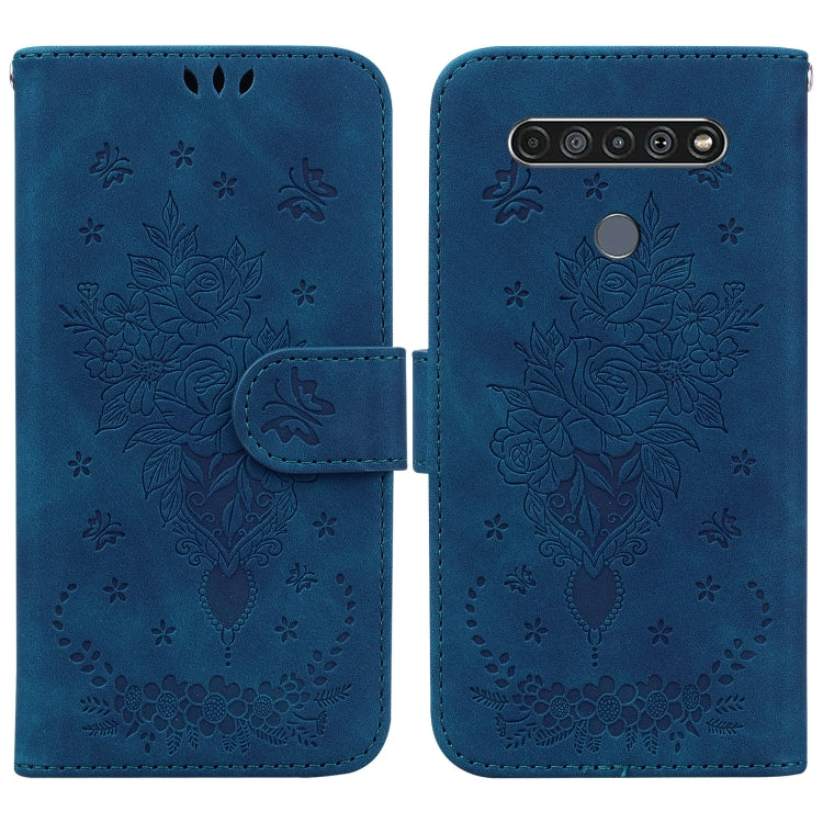 Caja para Teléfono LG K61 Butterfly Rose de Cuero en Relieve (Azul)