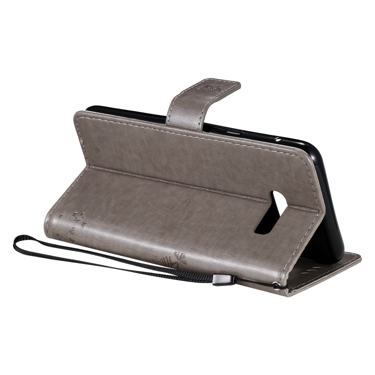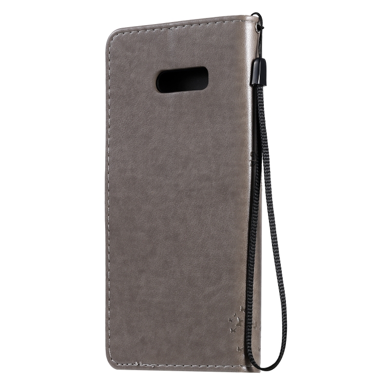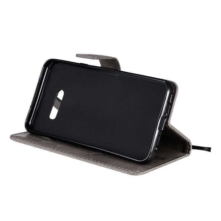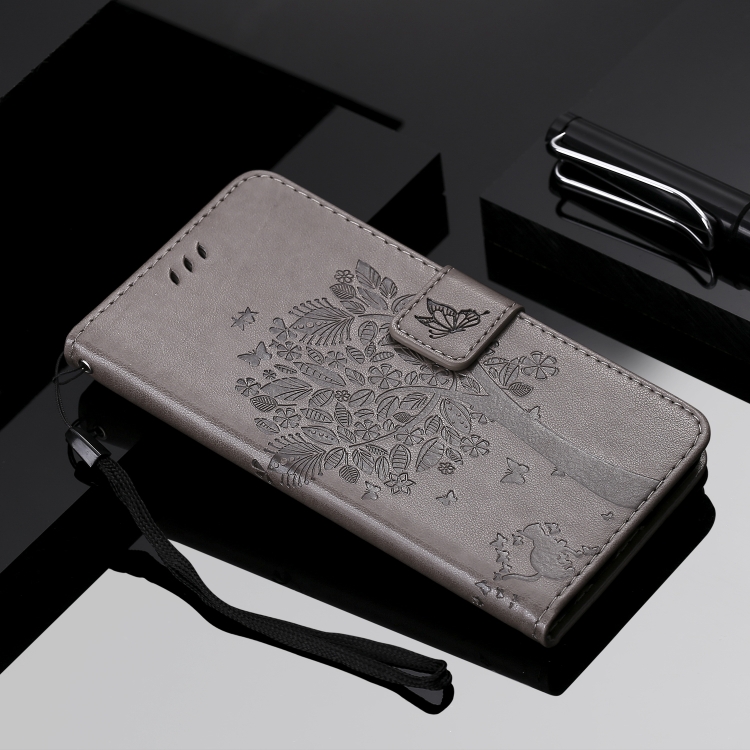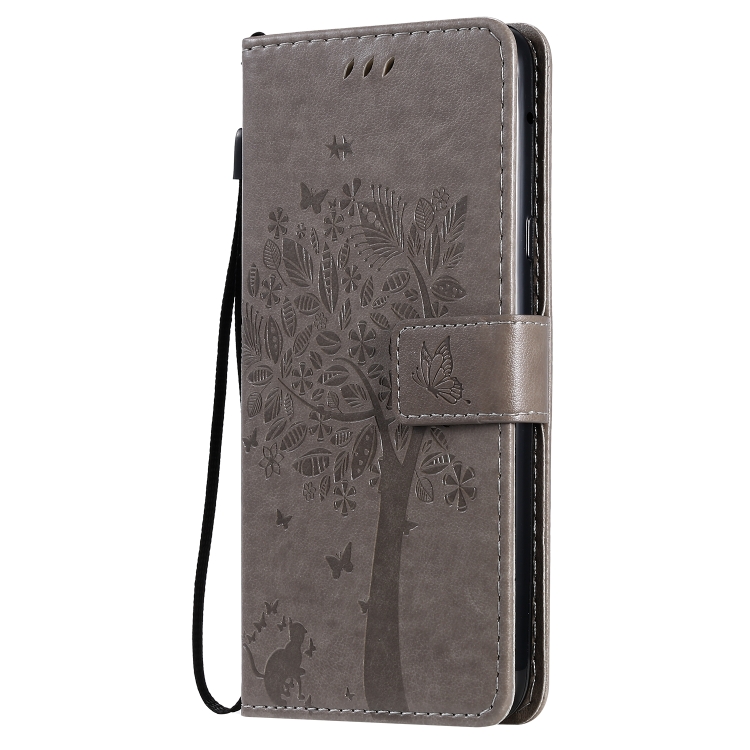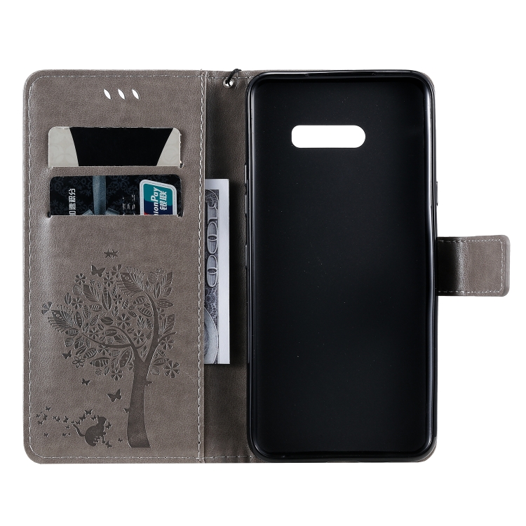 Funda de Cuero Pu para LG G8X con Diseño Árbol y Gato, Soporte, Ranuras para Tarjetas, Billetera y Cordón (Gris)