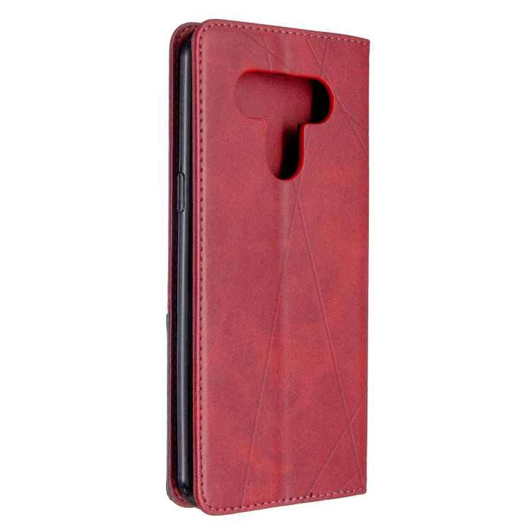 Estuche de Cuero Magnético para LG K51 con Tapa Horizontal, Textura de Rombo, Soporte y Ranuras para Tarjetas (Rojo)