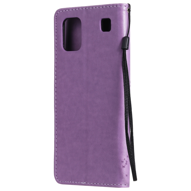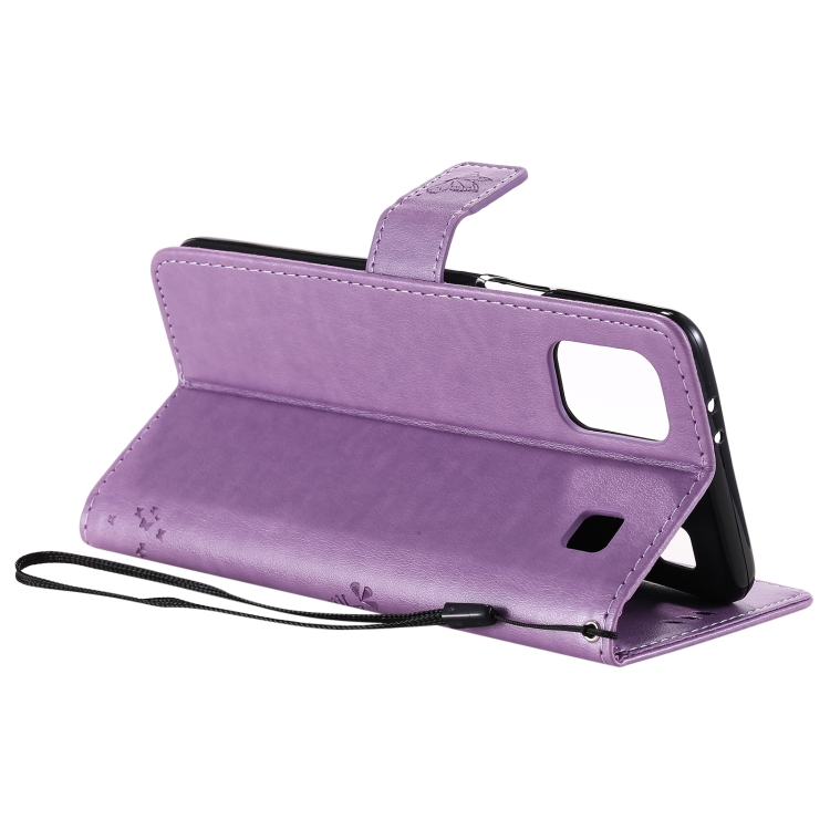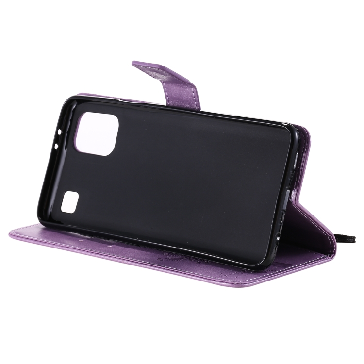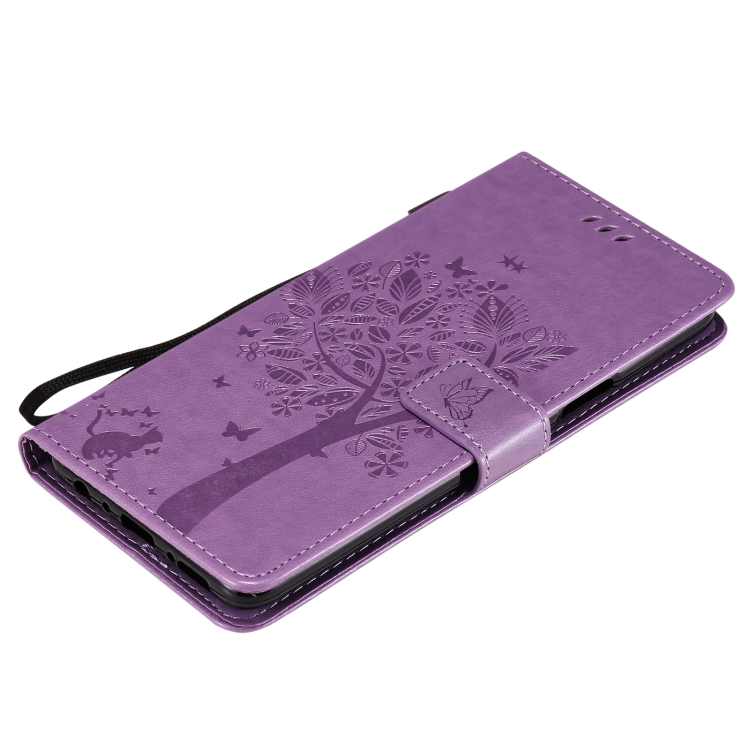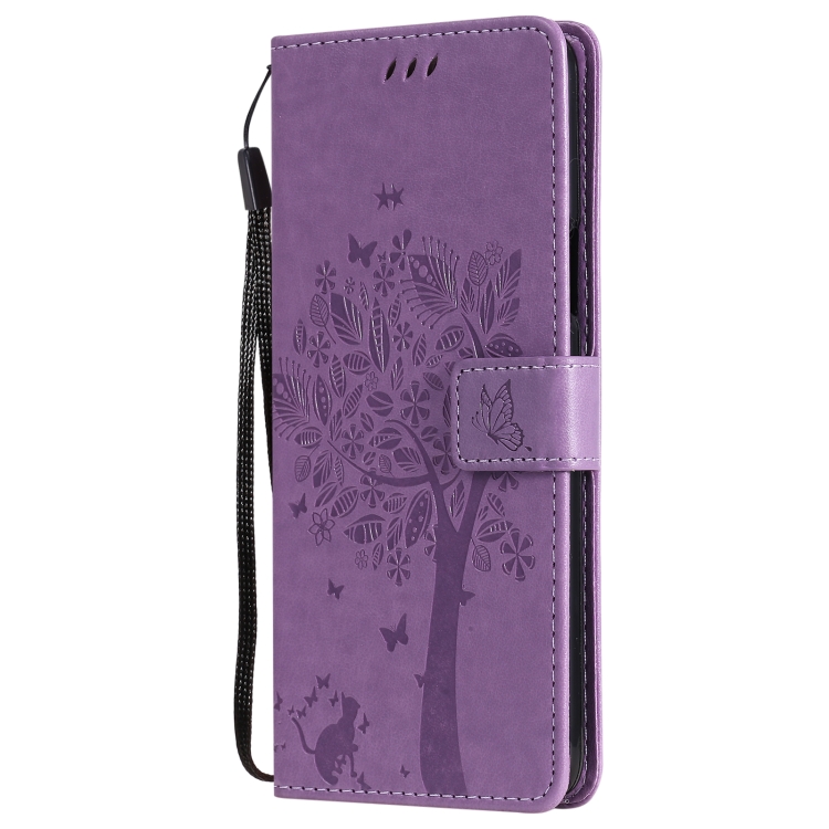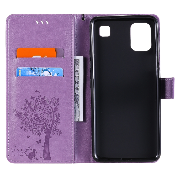 Funda de Cuero PU para LG K92 5G con Patrón Árbol y Gato, Soporte, Tarjetero y Cordón (Púrpura Claro)