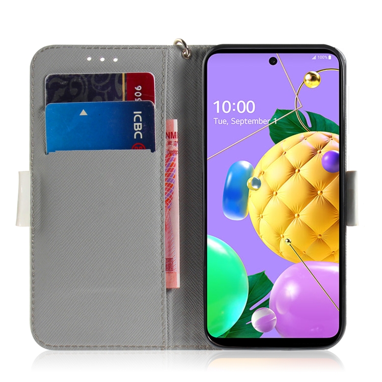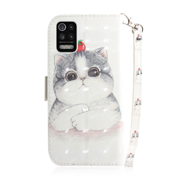 Funda Cuero Abatible Horizontal para LG Q52 con Dibujo 3D, Soporte, Ranuras y Cordón (Cute Cat)