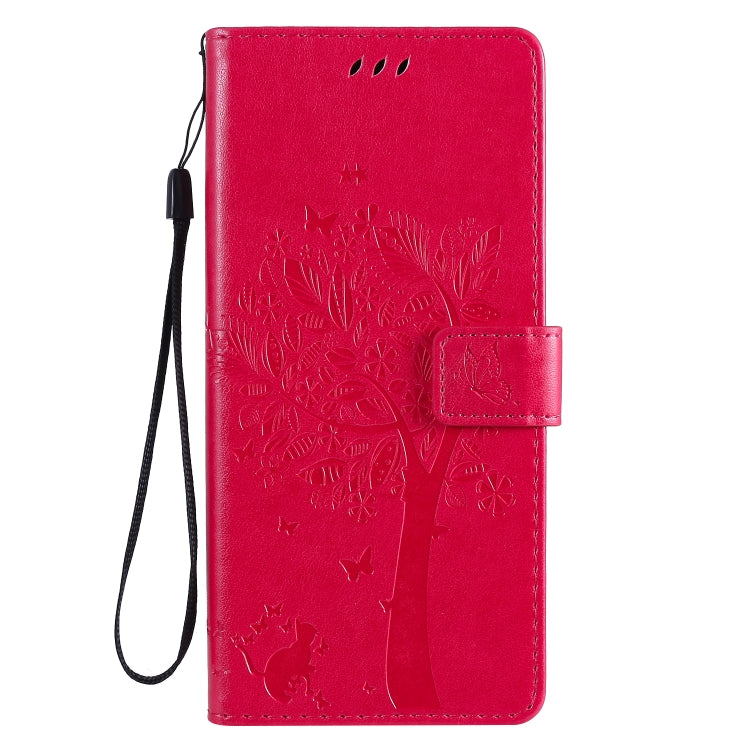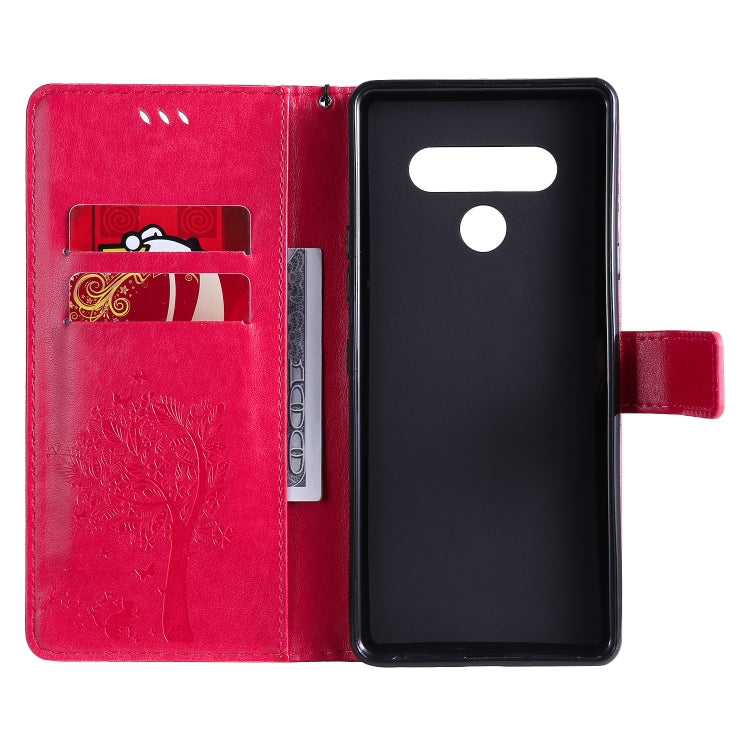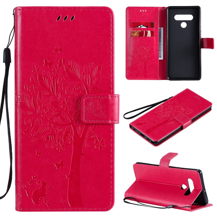 Funda de Cuero para LG Stylo 6 con Tapa Horizontal, Patrón Árbol y Gato, Soporte, Ranuras, Billetera y Cordón (Rosa Roja)