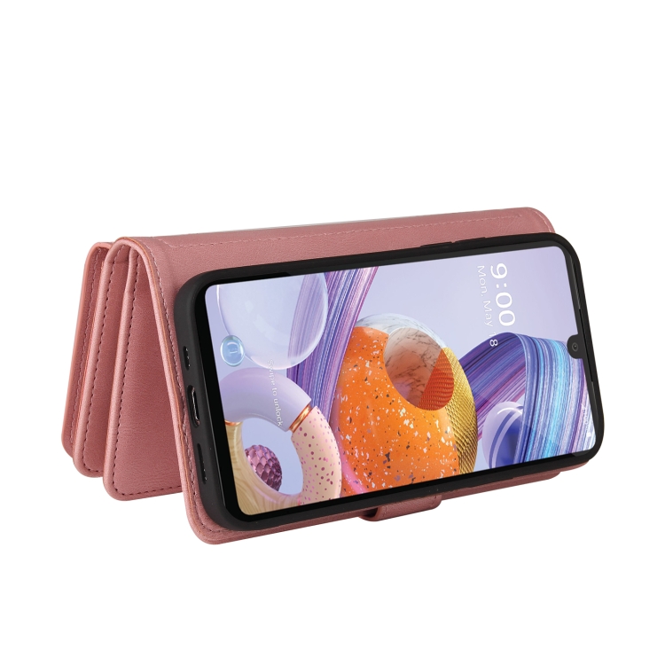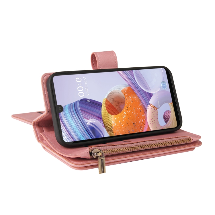 Funda de Cuero Horizontal Flip para LG Stylo 6 con Titular, 15 Tarjetas, Wallet, Zipper Pocket y Lanyard (Rosa)