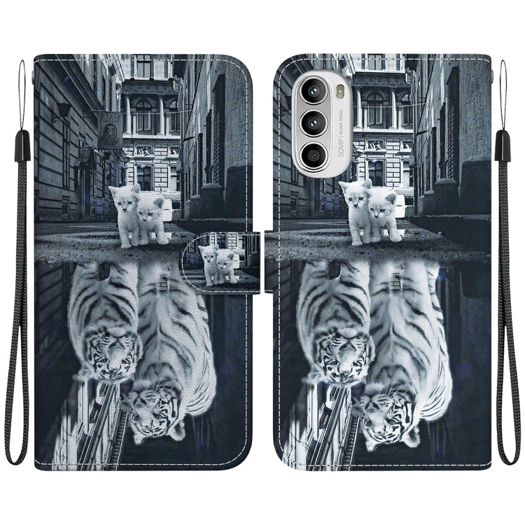 Funda de Cuero para Motorola Moto G52J Jp con Dibujo Coloreado y Textura de Cristal (Reflejo de Tigre Gato)