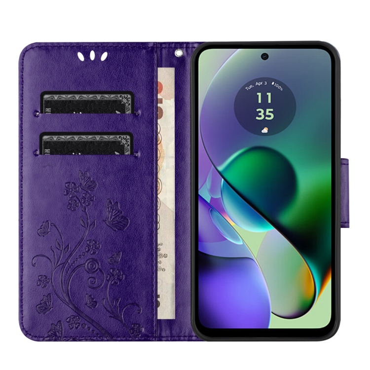 Funda para Motorola Moto G54 de Cuero con Tapa y Patrón de Flores y Mariposa (Púrpura Oscuro)