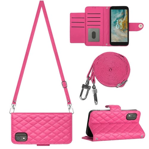 Funda de Cuero para Nokia C02 con Tapa, Textura Rómbica y Cordón Largo (Rojo Rosa)