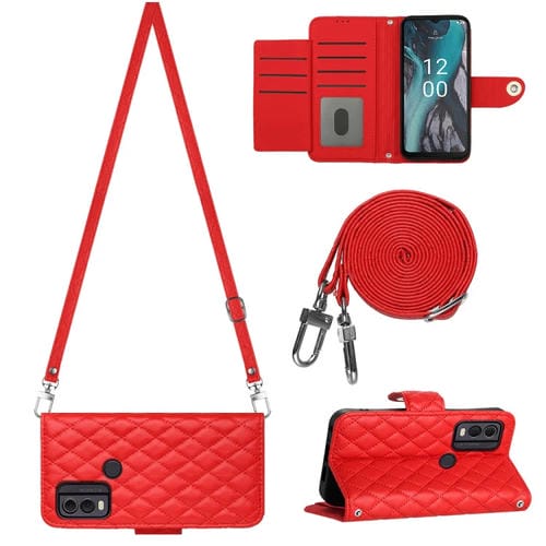 Funda de Cuero para Nokia C22 con Tapa Textura Rómbica y Cordón Largo (Rojo)