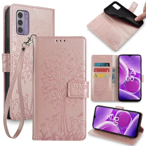 Funda de Cuero para Nokia G42 5G con Relieve de Árbol y Ciervo (Oro Rosa)