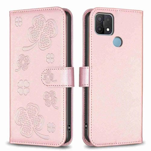 Para Oppo A15 Funda de Cuero con Relieve de Cuatro Hojas (Rosa)