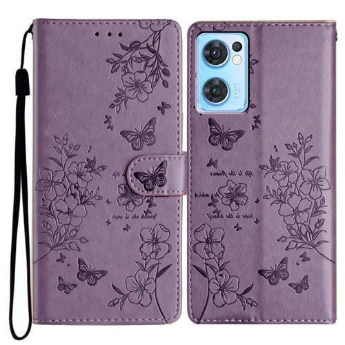Para Oppo Find X5 Lite Funda para Teléfono de Cuero con Relieve de Flor de Amor y Mariposa (Púrpura)