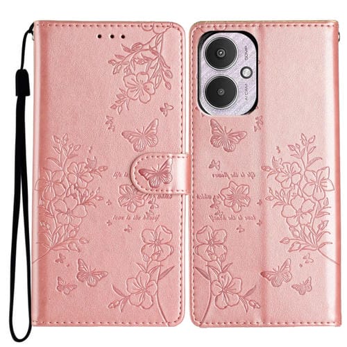 Para Redmi 13C 4G Funda de Cuero para Teléfono con Mariposas y Flores (Oro Rosa)