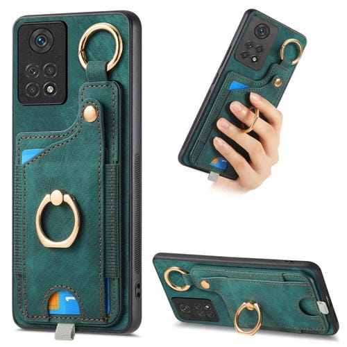 Para Redmi Note 11S Funda para Teléfono con Bolsa para Tarjeta con Anillo y Sensación de Piel Retro con Lazo para Colgar (Verde)