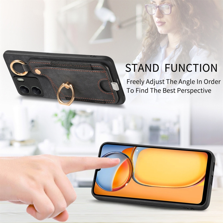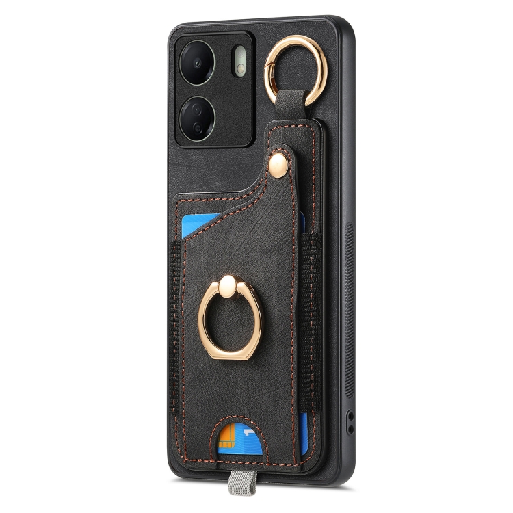 Para Redmi Note 12 Turbo Retro Skin-Feel Ring Card Bag Funda para Teléfono con Lazo para Colgar (Negro)