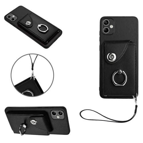 Funda para Teléfono Samsung Galaxy A04 4G de PU con Soporte para Anillo y Bolsa para Tarjeta con Cordón (Negro)